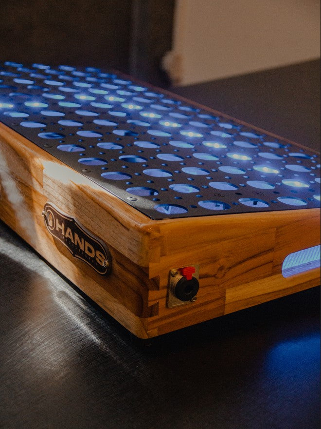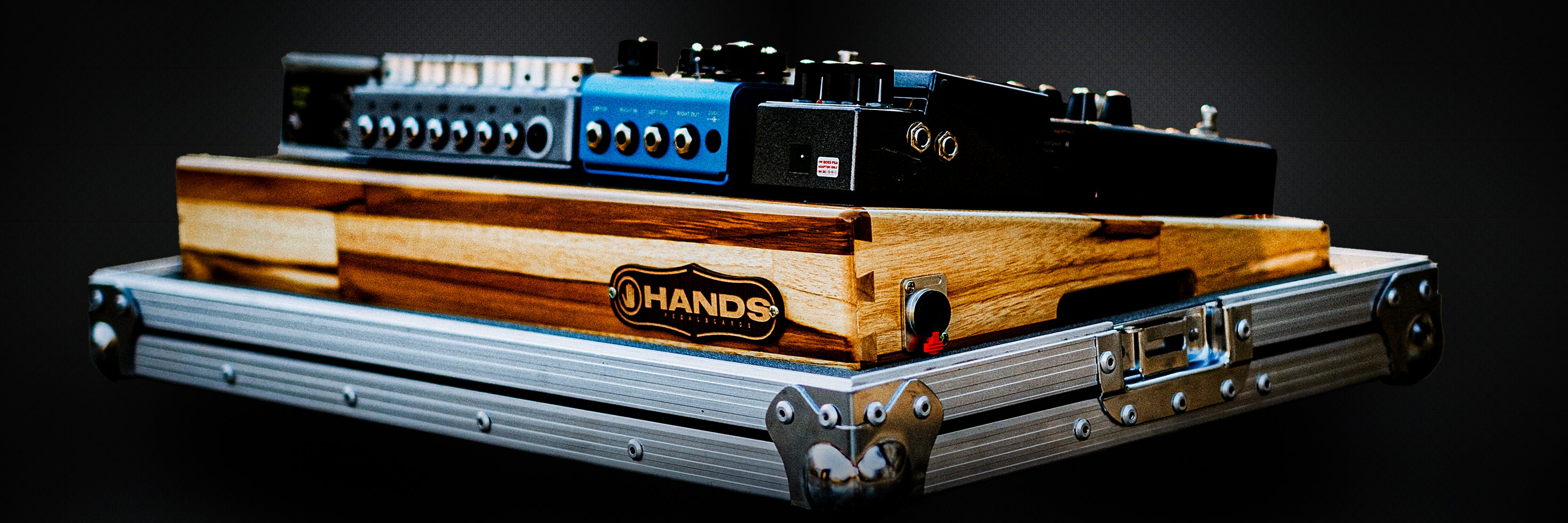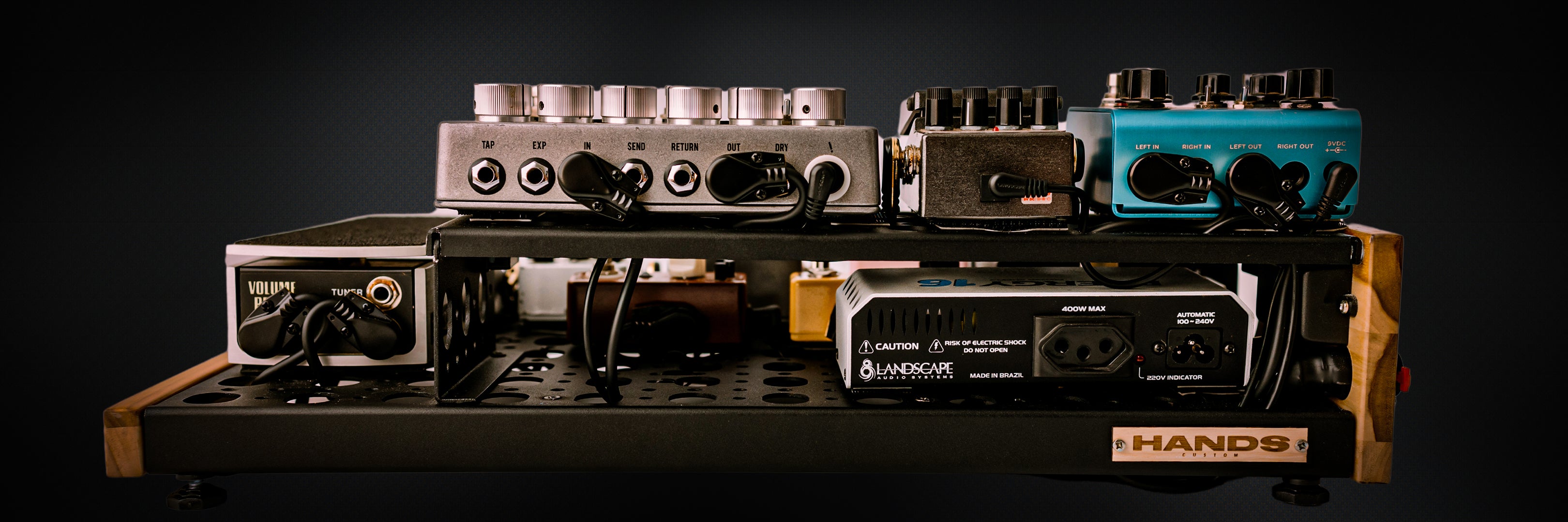 "Trabalhado com a harmonia da madeira e a resiliência do alumínio, nosso Pedalboard Hands Custom oferece qualidade incomparável. Não só possui um excelente acabamento, mas também prolonga a vida útil dos pedais da sua guitarra."