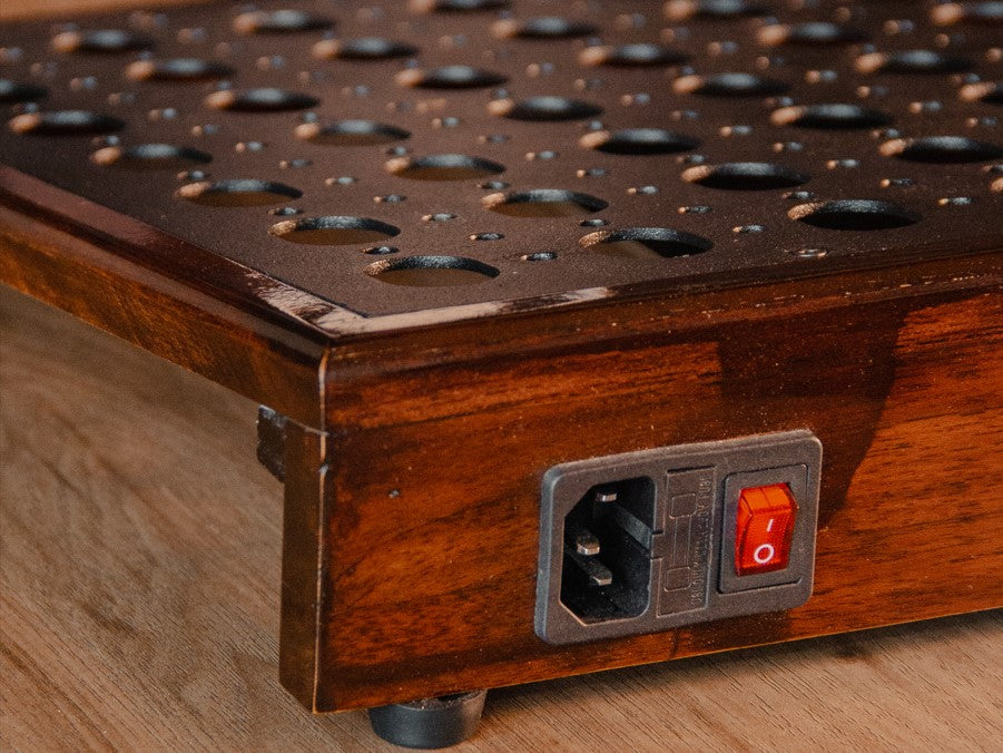 “Unimos a beleza única da madeira teca-mosaíco com nosso meticuloso processo de verniz e tratamento, garantindo que cada Pedalboard seja uma obra-prima de qualidade, durabilidade e estilo.”
